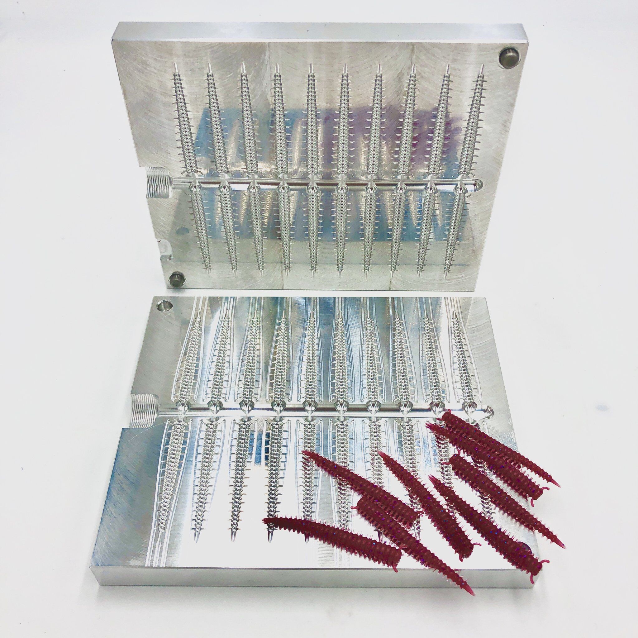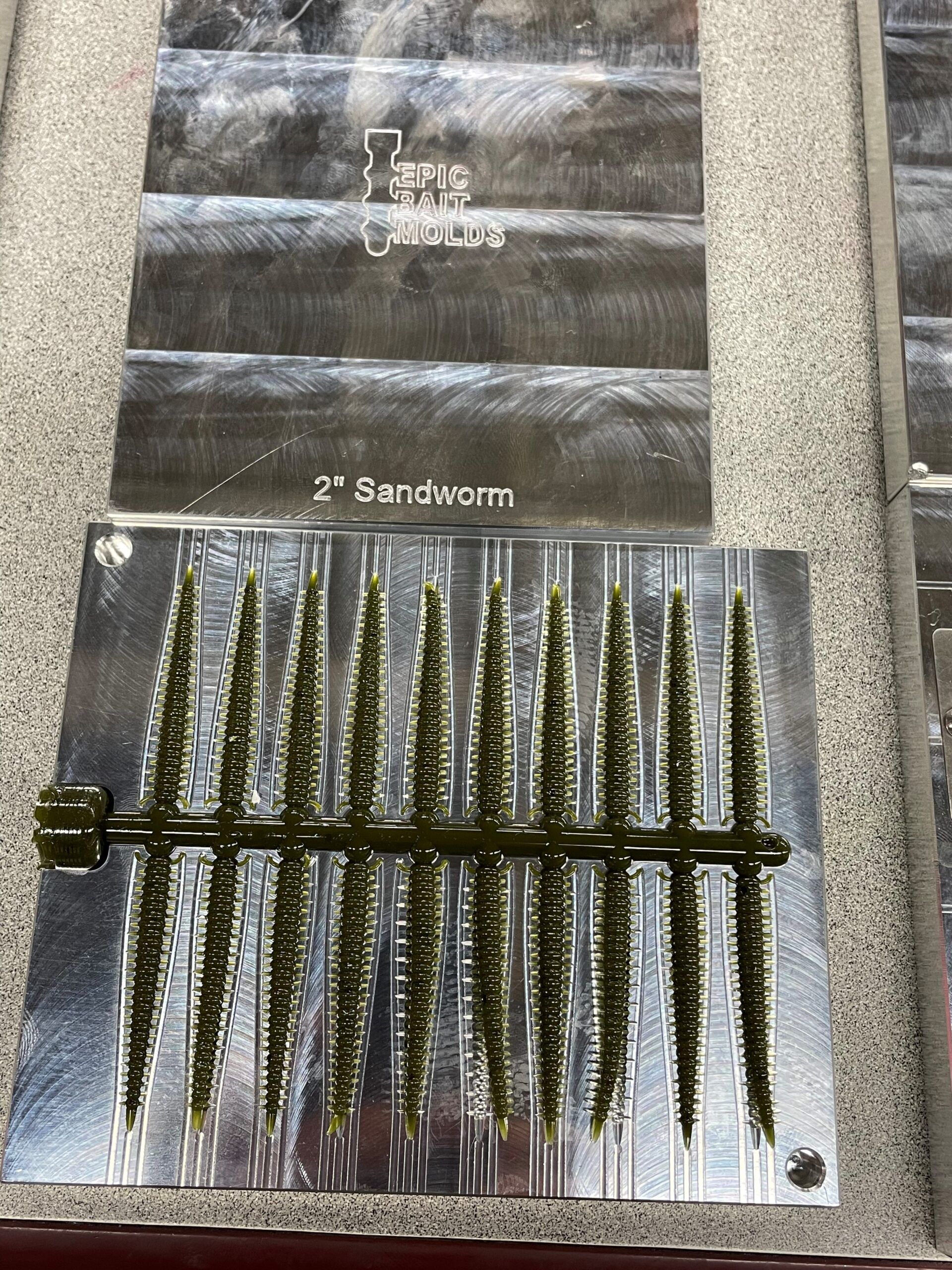 The 2 Inch Sandworm bait measures 2″ from end to end and the bait’s round/ribbed body section measures .215″ wide x .175″ tall at the thickest part. The tiny projections/legs along the sides of the body are flat on one side, rounded on other and taper to a point. This allows for lots of movement and light to reflect or “flash” off of the flat side. Every other leg is on opposite sides of the mold.